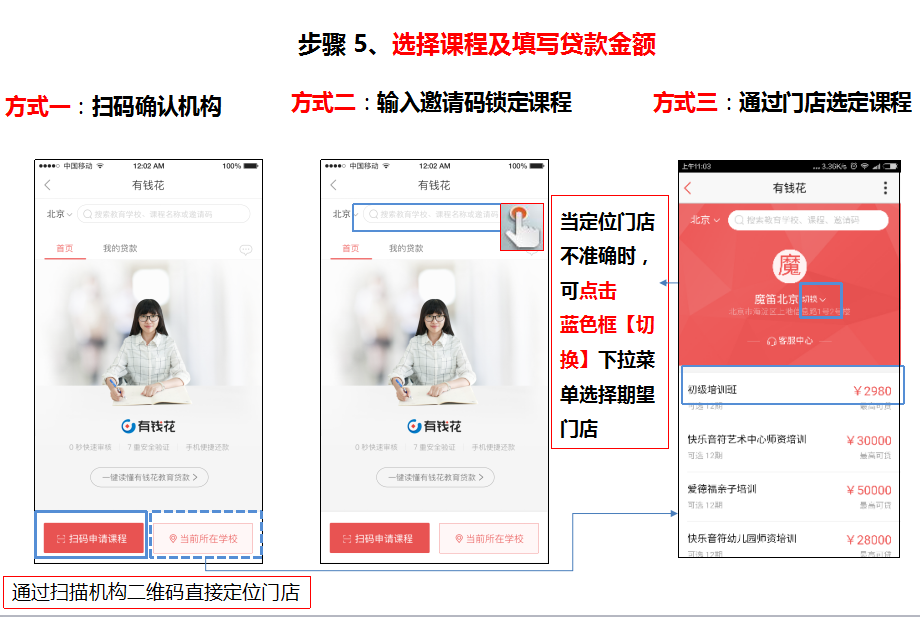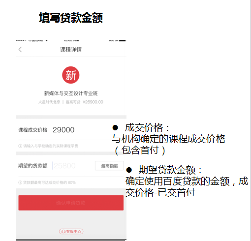 方式三:通過(guò)門(mén)店選定課程,填寫(xiě)貸款金額【成交價(jià)格:與機(jī)構(gòu)確定的課程成交價(jià)格(包含首付);期望貸款金額:確定使用百度貸款的金額,成交價(jià)格-已交首付】