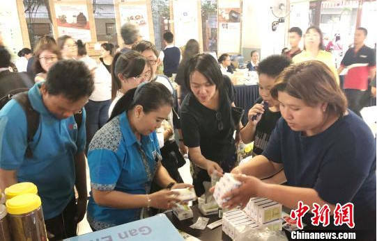 ▲圖為由中國(guó)知名中成藥企業(yè)主辦的一場(chǎng)活動(dòng)中,印尼民眾爭(zhēng)相購(gòu)買太極藿香正汽口服液。鐘欣 攝