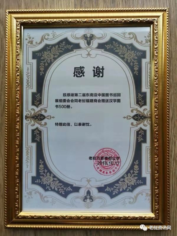 贈書活動儀式安排在學(xué)校會議室舉行,寮都公學(xué)董事長林俊雄從老撾福建商會代表們手中接過由第二屆東南亞中國圖書巡回展組及老撾福建商會共同向竂都公學(xué)捐贈的價值近3萬元的圖書。據(jù)介紹,本次捐贈圖書內(nèi)容涵蓋中國傳統(tǒng)文化、經(jīng)典文學(xué)、漢語學(xué)習(xí)為主等各類圖書500冊。交接儀式結(jié)束完畢后,林俊雄董事長當(dāng)場向老撾福建商會代表頒發(fā)了受贈感謝狀。