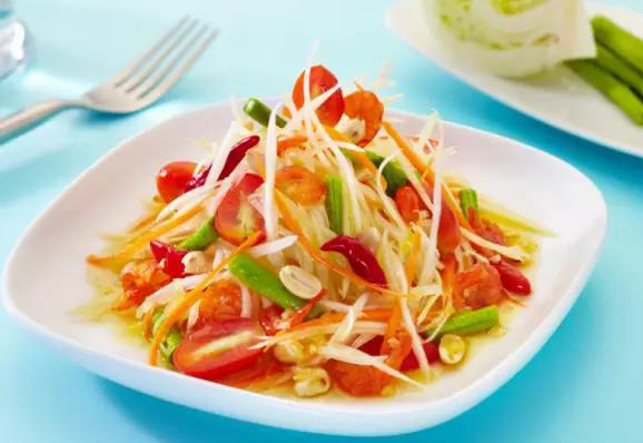 一道味道十分濃烈的沙拉,也是一種深受老撾人喜愛的涼菜,與一般的水果沙拉不同,青木瓜沙拉的主料為生木瓜,剁切成極細(xì)的絲,用鹽控去苦澀,以魚露、辣椒、蔥、蒜等舂拌,酸辣香脆,清涼爽口,當(dāng)?shù)厝瞬坏燥垥r(shí)吃,有時(shí)還當(dāng)零食享用,在街邊的小攤上顧客可以自選輔料然后放進(jìn)研缽中搗成沙拉。