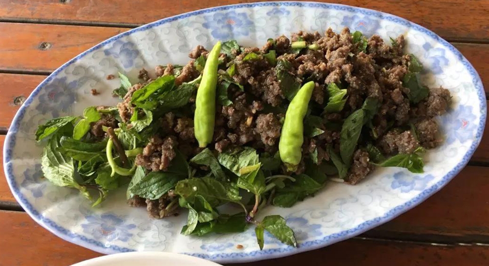 老撾語叫Lahp,老撾最著名的代表菜之一,其做法是將新鮮的雞肉、豬肉、牛肉或魚肉剁碎,拌以魚露、辣椒、鹽、青檸、香茅、薄荷等多種佐料制成,味道鮮美獨(dú)特。這個(gè)特色菜分生、半熟和全熟,點(diǎn)的時(shí)候一定要說清楚,否則對于吃慣了熟食的人來說很難下咽。