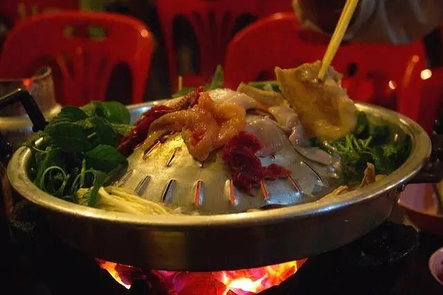 老式火鍋為涮烤兩吃,跟中式火鍋還是有很大區(qū)別的。火鍋的形狀更像一個(gè)有沿兒的平底鍋,中間高高鼓起,可用于燒烤,周圍盛湯用于涮煮,還有大廚現(xiàn)場烤制的大蝦、生蠔、牛肉串等食物,配上一瓶老撾啤酒,盡享美食。