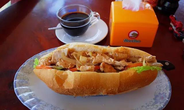 老撾語叫khao ji,之所以在老撾如此常見是跟法國的殖民歷史密切相關(guān),無論是餐廳還是路邊攤,法棍隨處可見,游客們最愛的還是將法棍面包切成兩半后夾入一些雞肉、牛肉、火腿、豬肉、雞蛋、蔬菜等不同餡料和醬料,制成三明治,既美味又實(shí)惠。