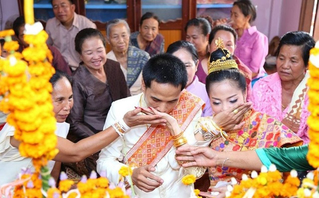 感恩儀式是婚禮上一項重要程序,過程也非常復雜,新郎新娘要感謝雙方父母養(yǎng)育之恩,雙方家長要宣講老撾的“十二風”、“十四俗”,強調夫妻互敬之德,提醒雙方尊敬老人。