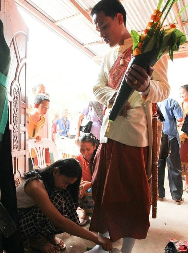 老撾婚禮中有一個很重要的儀式,老撾語稱“女婿游行”。即婚禮當天,新郎按傳統(tǒng)風格打扮,穿兜襠褲,配寶劍,手拿甘蔗和鮮花(象征保衛(wèi)愛情和創(chuàng)造甜蜜美好的新生活)前往新娘家。在距離新娘家還有一段距離時,所有人必須下車,步行向新娘家走去。為體現男方家的誠意和身份,迎親隊伍會制造隆重熱烈的場面和氣氛,一路敲鑼打鼓,鳴放鞭炮,載歌載舞。