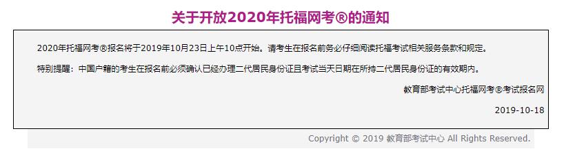 教育部考試中心托福網(wǎng)考考試報名網(wǎng)發(fā)布了通知,2020年托福報名將于2019年10月23日上午10點開始。