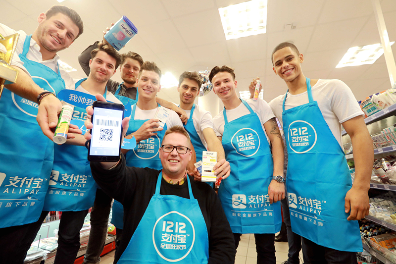 當(dāng)?shù)貢r(shí)間12月11日,德國“網(wǎng)紅”阿福(前排中)在法蘭克福市中心一家Rossmann日化連鎖為“雙12”促銷活動(dòng)助陣。受到中國國內(nèi)民眾歡迎的“雙12”購物狂歡今年由支付寶引入德國。