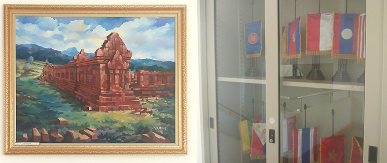 二樓樓梯拐角處掛著老撾古老寺廟油畫,旁邊的柜子里整齊擺放著幾排各國(guó)國(guó)旗;三樓樓梯拐角處掛的則是川壙省石缸平原油畫,充滿了藝術(shù)氛圍。