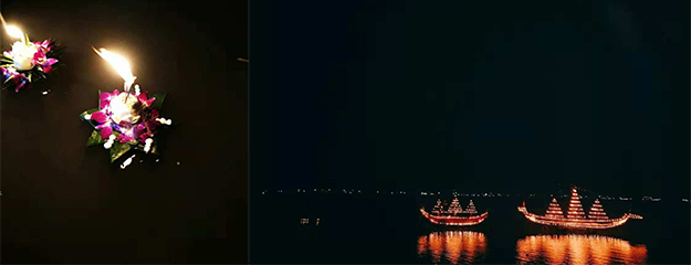 水燈是用象征著力量和財富的芭蕉葉折疊制成的,有的折成葵花狀,有的折成寶塔狀,折好的水燈上會插上鮮花和香燭,燃放爆竹之后,人們將香燭點燃,緩緩放入水中。剎那間,映著傾城月色,河面上燈火萬點,忽遠忽近,隨波漂蕩,蔚為壯觀。