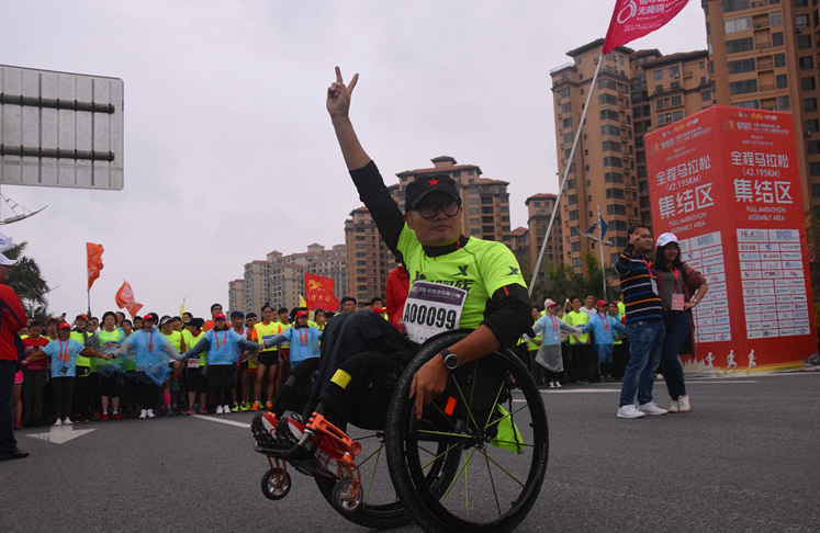 在眾多的選手中,坐在輪椅上的張先生顯得尤為搶眼。張先生來自廣州,他告訴記者,這是他參加的第54場馬拉松比賽,也是第一次參加全海景跑道的馬拉松, “我參加比賽不是為了出成績或出風(fēng)頭,而是重在參與,是想體現(xiàn)一種精神?!睆埾壬f,他不一定能全部“跑”完全程,但他一定會堅(jiān)持到最后。